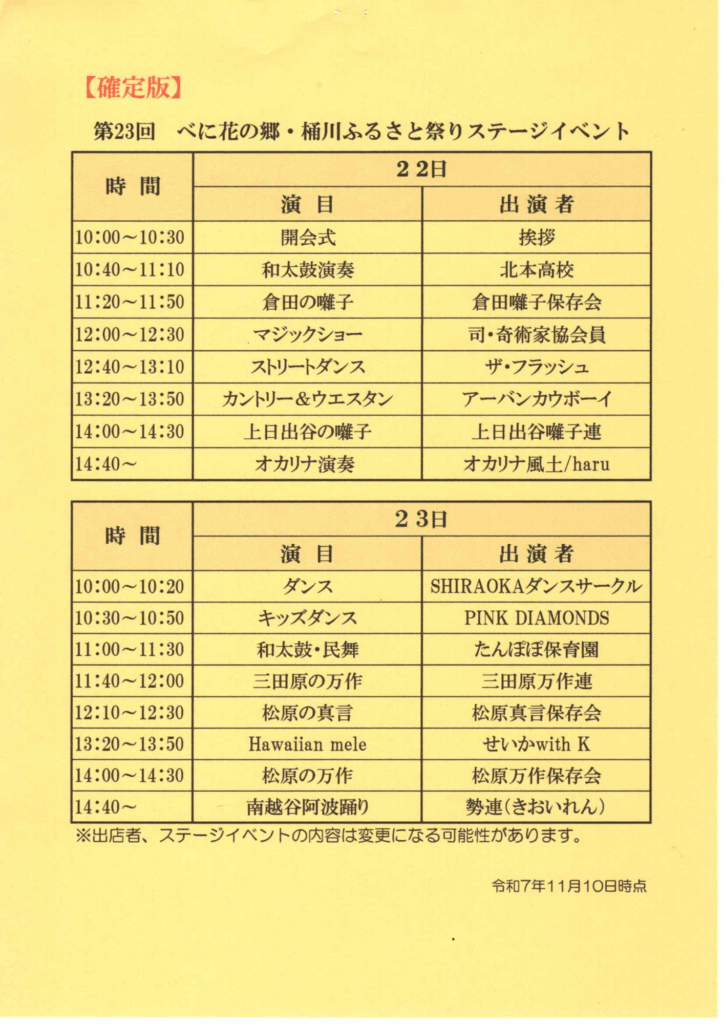 2025 1119 イベント情報 第23回べに花の郷・桶川ふるさと祭り 毎年恒例の桶川ふるさと祭りを開催致します。ポスターや桶川市広報とは一部変更になっております。ご確認ください。 ジャガイモ掘り延期のお知らせ 前の記事 12月の講座・イベント情報 次の記事